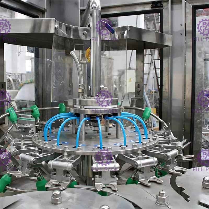 6) ফিলিং ভালভ নিচে চলে এসে বোতল ঘাড় স্পর্শ করলে খোলে এবং ভর্তি শুরু হয়, ভর্তি শেষ হলে ফিলিং ভালভ উপরে উঠে বোতল ঘাড় ত্যাগ করে।